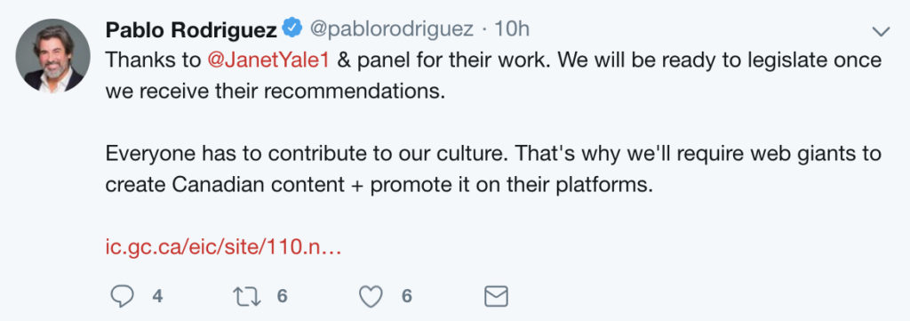 Yesterday, Canadian Heritage Minister Pablo Rodriguez signalled that the government’s position on the major broadcasting – Canadian cultural issue is also set. For months, government officials have argued that large Internet companies need to contribute to Canadian content creation, thought it has avoided specifying precisely how. For example, former-Canadian Heritage Minister Melanie Joly said: