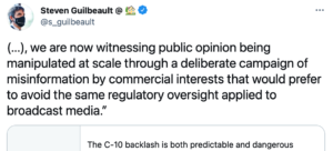 Given the opposition – as well as Guilbeault’s well-documented disastrous interviews on CBC and CTV – one would have thought the Minister would be seeking to assuage public concern. Instead, Guilbeault took to Twitter last night to suggest that the public anger over Bill C-10 was a matter of “public opinion being manipulated at scale through a deliberate campaign of misinformation by commercial interests that would prefer to avoid the same regulatory oversight applied to broadcast media.”